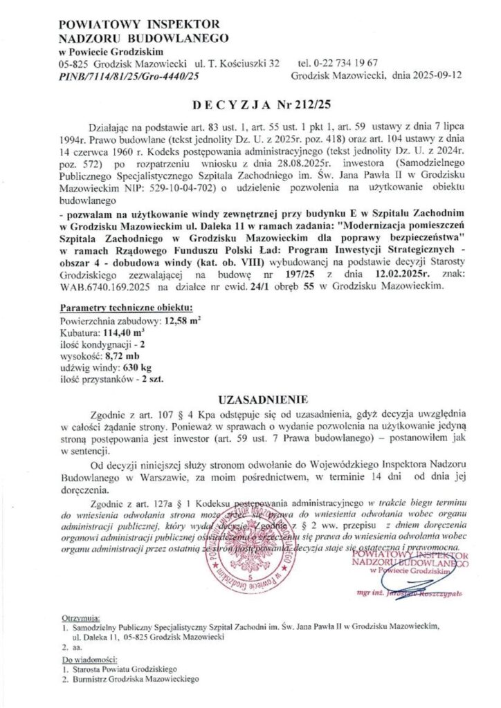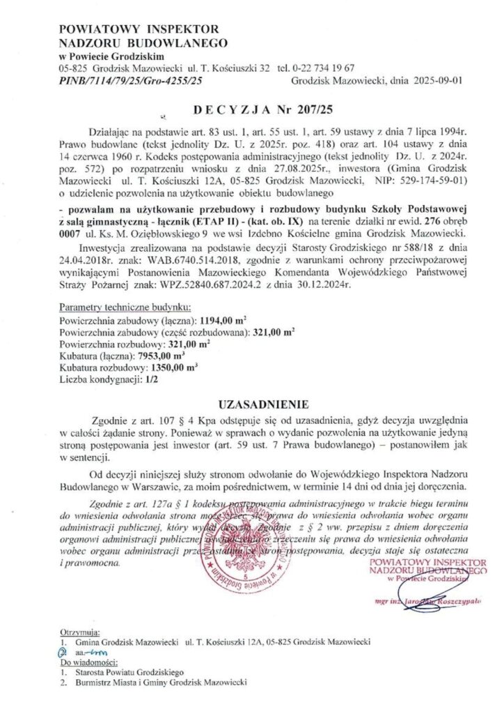 informuje, że z dniem 25.09.2025r.  potwierdzono możliwość użytkowania dodatkowej części pomieszczeń parteru budynku szkoły przy ul. Żwirki i Wigury 4 w Grodzisku Mazowieckim –  6 pomieszczeń o łącznej powierzchni użytkowej 114,9 m2.