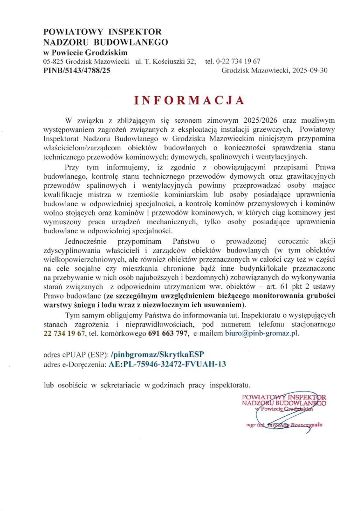W związku z powyższym, w celu uniknięcia zagrożeń, zwracam się do wszystkich zobowiązanych o bezzwłoczne spełnianie obowiązków wynikających z ww. przepisów.