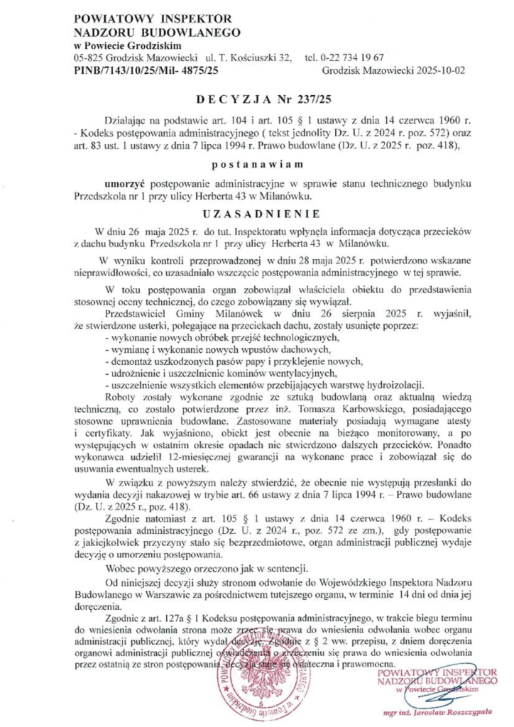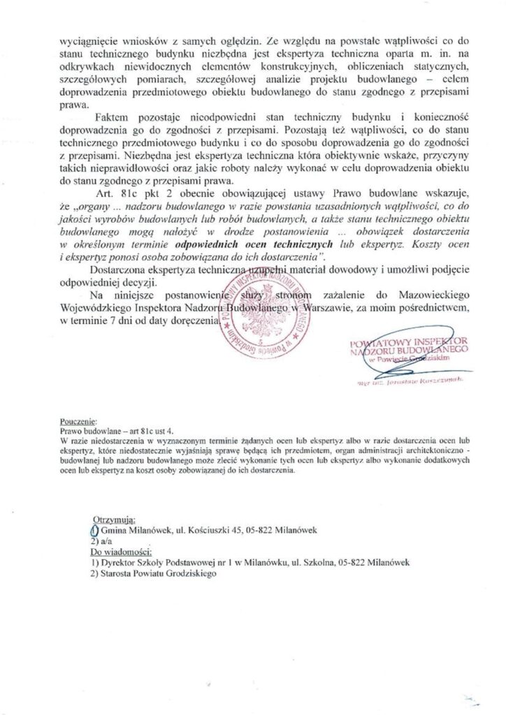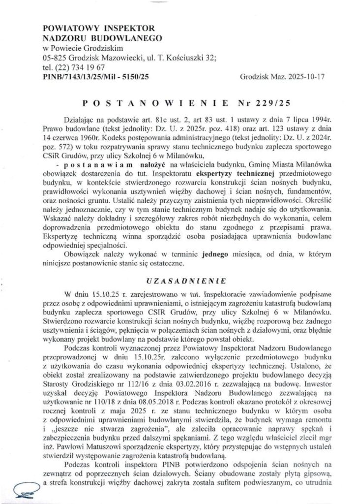 PINB w Grodzisku Mazowieckim informuje, że w dniu 13.05.2024r. miał miejsce pożar budynku szkolnego przy ul. Żwirki i Wigury 4 w Grodzisku Mazowieckim. W ramach działań kompetencyjnych służby nadzoru budowlanego decyzją nr 107/24 z dnia 14.05.2024r. wyłączono z użytkowania przedmiotowy obiekt budowlany. W załączeniu dokumentacja fotograficzna aktualnego stanu technicznego budynku.