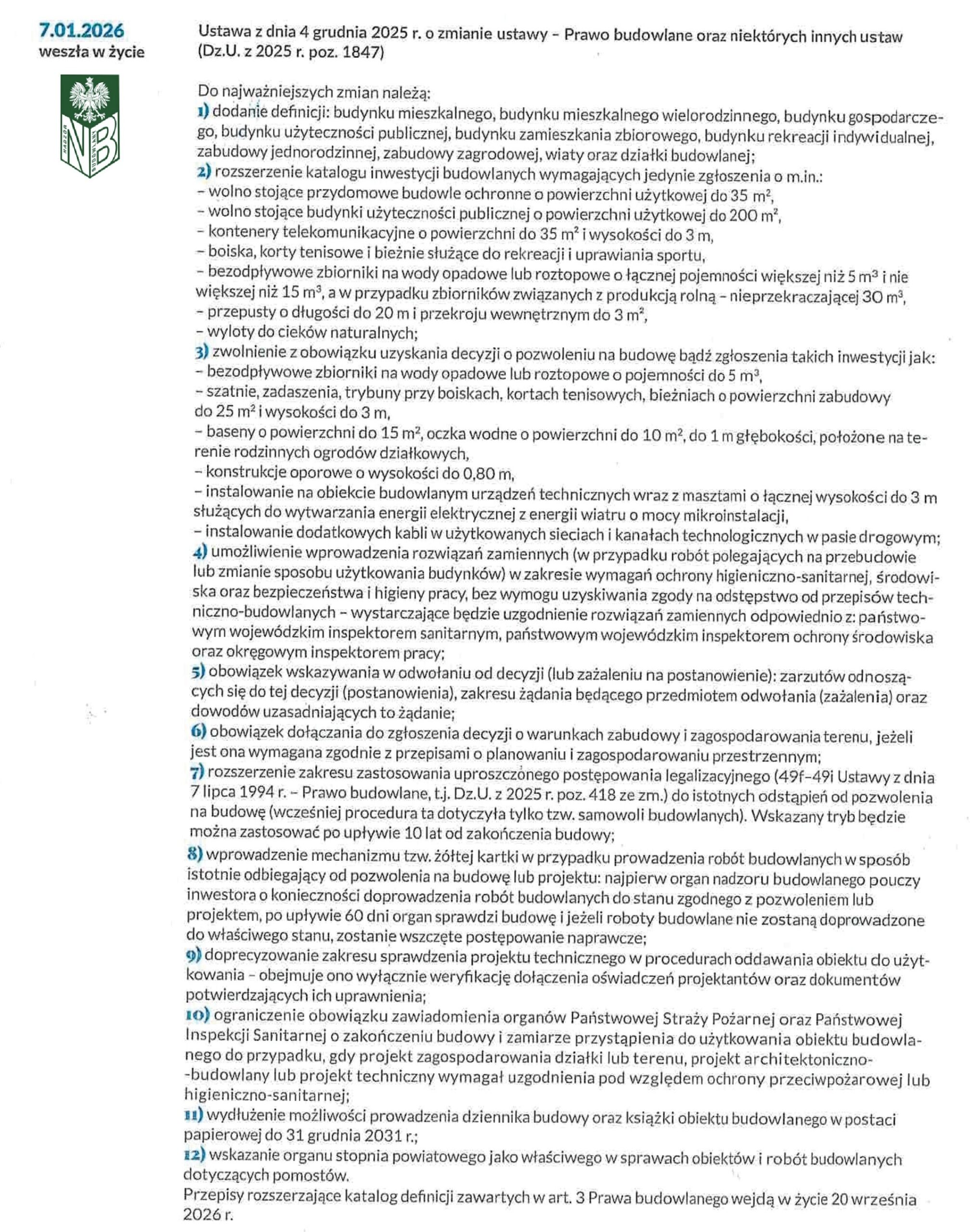 Ustawą z dnia 7 października 2022 r. znowelizowano przepisy Ustawy z dnia 7 lipca 1994 r. – Prawo budowlane. Zmiany polegają na wprowadzeniu obowiązku dołączenia do zawiadomienia o zakończeniu budowy lub wniosku o udzielenie pozwolenia na użytkowanie kopii świadectwa charakterystyki energetycznej przekazanego w postaci papierowej albo wydruku świadectwa charakterystyki energetycznej przekazanego w postaci elektronicznej. Obowiązek ten nie będzie miał zastosowania do budynków, dla których nie jest wymagane sporządzenie świadectwa